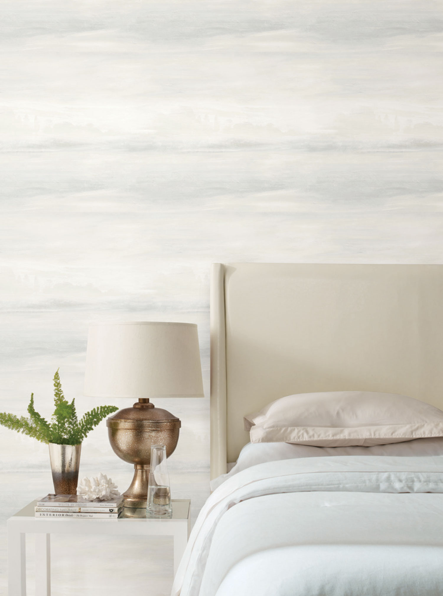 Grau-cremefarbene Vliestapete, das Muster erinnert an eine handgemalte Landschaft im Nebel.
