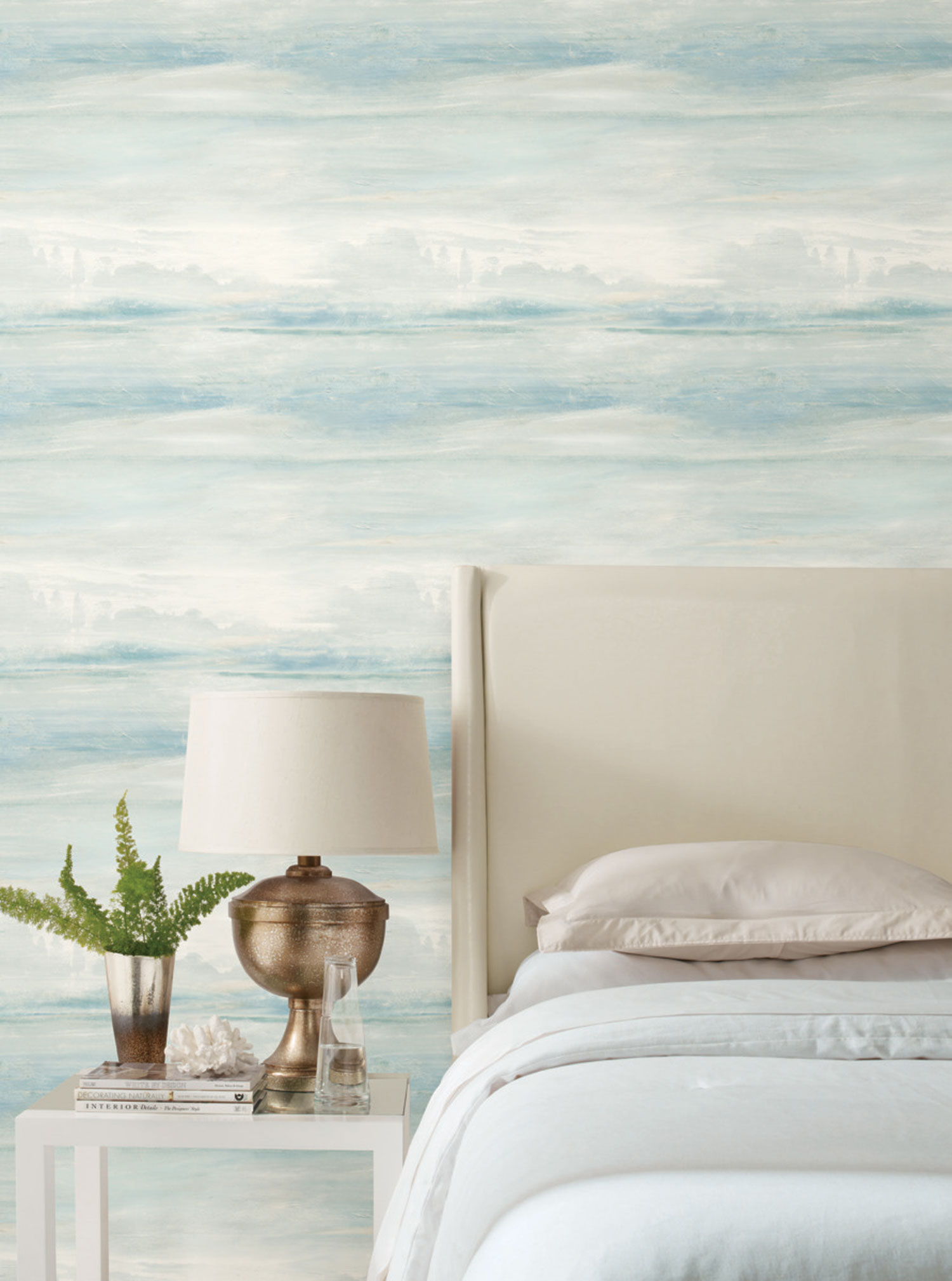 Blaugrüne Vliestapete, das Muster erinnert an eine handgemalte Landschaft im Nebel.