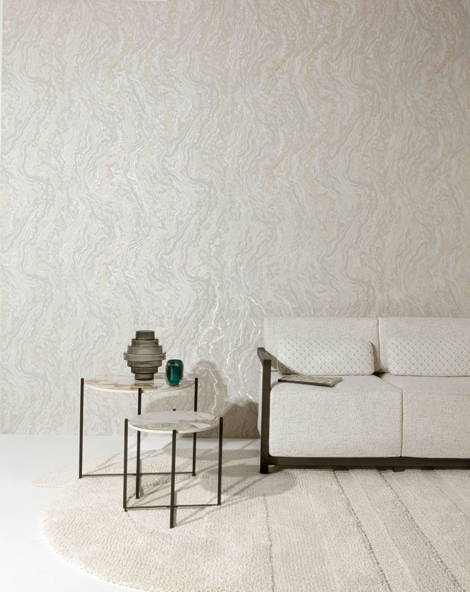 Marmorierte Vliestapete mit Vinyloberfläche, Grau-Beige-Töne. Das Foto des Innenraums dient nur zur Veranschaulichung – verschiedene Farben.