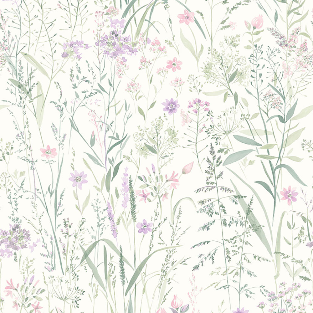 Weiße Vliestapete, Wiesengräser und Blumen in Grün- und Rosatönen, Stoffstruktur.