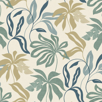 Cremefarbene Vliestapete mit Blättern in Grün-, Blau- und Ockertönen, Stoffstruktur.