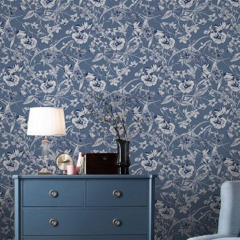 Mattblaue Vliestapete, metallisches silbernes Blumenmuster.