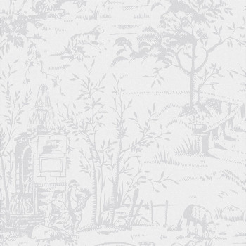 Vliestapete, ein romantisches Motiv, inspiriert von historischen Toile de Jouy-Stoffen.
