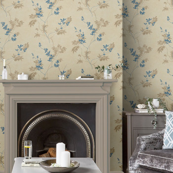 Halbglänzende goldbeige Vliestapete, Motive aus Zweigen und Blättern in Braun- und Blautönen.