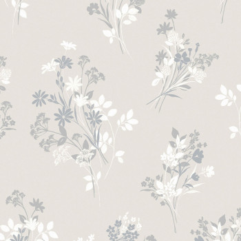 Graue Vliestapete, Blumenmotive in Grau- und Weißtönen.