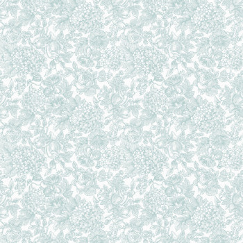 Glatte türkis-weiße Vliestapete, florale Motive.
