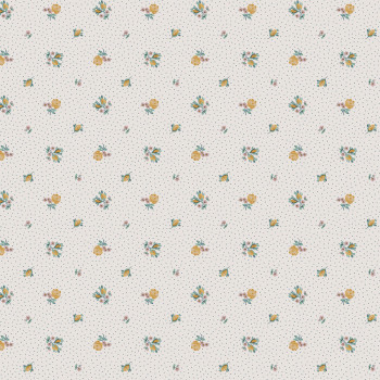 Hellgraue Vliestapete mit kleinen blauen Punkten, einem kleineren Blumenmuster in Grün-, Ocker- und Lavendeltönen.