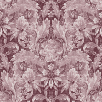 Vliestapete, reiches Blumenmuster in Brombeertönen.
