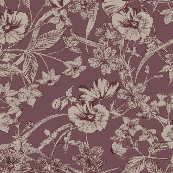 Matte brombeerfarbene Vliestapete, metallisch-goldenes Blumenmuster.