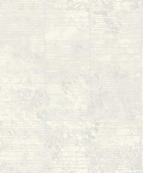Luxuriöse Vliestapete in weißer Farbe mit geprägtem geometrischen Muster in Silber auf einem Hintergrund, der Stuckputz imitiert.