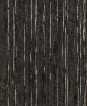 Luxuriöse schwarze Vliestapete mit geprägten goldenen Streifen auf einem Hintergrund, der Stuckputz imitiert.