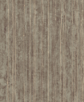 Luxuriöse graubraune Vliestapete mit geprägten goldenen Streifen auf einem Hintergrund, der Stuckputz imitiert.