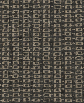 Luxuriöse schwarze Vliestapete mit geprägtem geometrischen Muster in Gold auf einem Hintergrund, der Stuckputz imitiert.