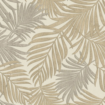 Luxuriöse Vliestapete mit Vinyloberfläche, Blattmotiven in metallisch glänzenden Beige- und Brauntönen auf beigem Hintergrund.