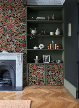 Vliestapete, schwarzer Hintergrund, Blumen in Grün-, Rot- und Orangetönen.
