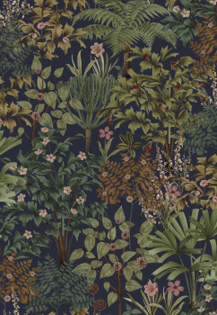 Dunkelblaue Vliestapete, florales Muster in Grün, Zartrosa, Braun und Ocker.
