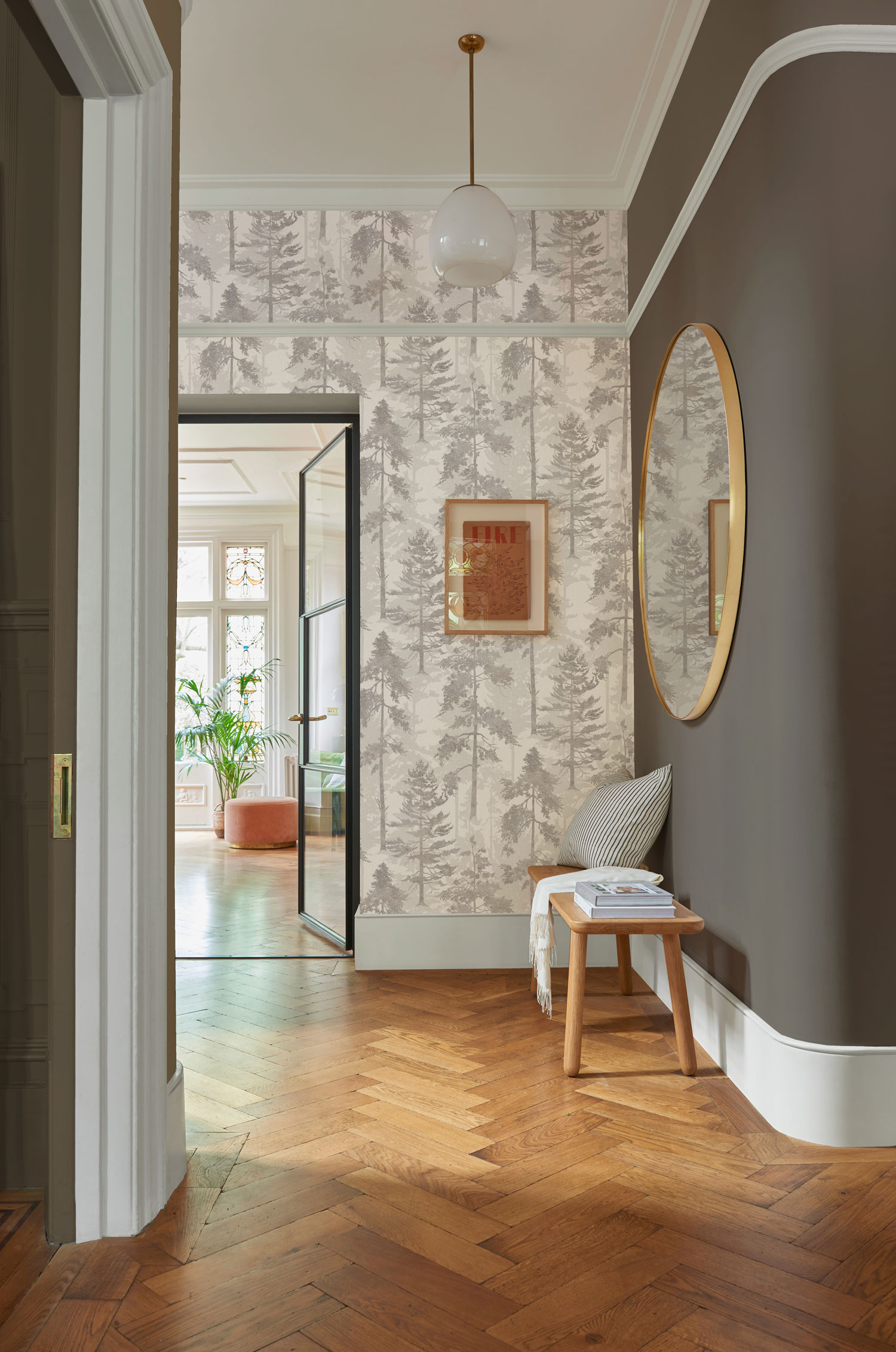 Graubraune Vliestapete, Motiv Wald, Bäume.