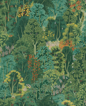 Grüne Vliestapete, wildes Naturmotiv - Bäume, Blätter, Blumen.