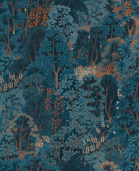 Blaue Vliestapete, wildes Naturmotiv - Bäume, Blätter, Blumen.