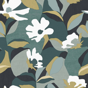 Luxuriöse Vliestapete mit Vinyloberfläche, Motiv aus weißen Blumen mit Blättern, Grün-, Beige- und Schwarztönen. Das Foto des Innenraums dient nur zur Veranschaulichung – verschiedene Farben.