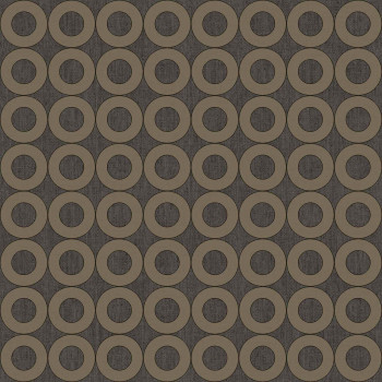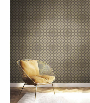 Luxuriöse geometrische Vliestapete mit Vinyloberfläche, einem Muster aus goldenen Ringen auf schwarzem Hintergrund.