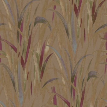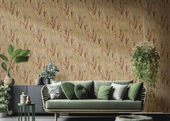 Luxuriöse sandfarbene Vliestapete mit Vinyloberfläche, Motive aus Grasblättern, Sandtöne, Rosa und Blau, Stoffstruktur.