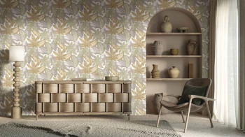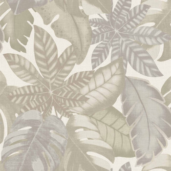 Luxuriöse cremefarbene Vliestapete mit Vinyloberfläche, Motiven tropischer Pflanzenblätter, Beige- und Grautönen, Stoffstruktur. Das Innenfoto dient nur zur Veranschaulichung – verschiedene Farben.