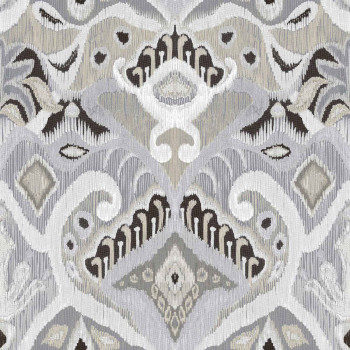 Luxuriöse graue Vliestapete mit Vinyloberfläche, geometrisches Motiv, das an ethnische Muster erinnert, Grau-, Beige- und Schwarztöne, Streifenstruktur.