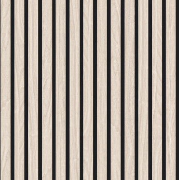 Beige-schwarze Vliestapete, Imitation von Holzplanken mit fein geprägter Struktur.