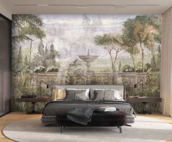 Luxus-Vlies-Fototapete mit geprägter Textiloberfläche, Gartenmotiv mit Springbrunnen. Abmessungen B. 5,10 m x H. 3 m 5 Teile 1,02 m x 3 m