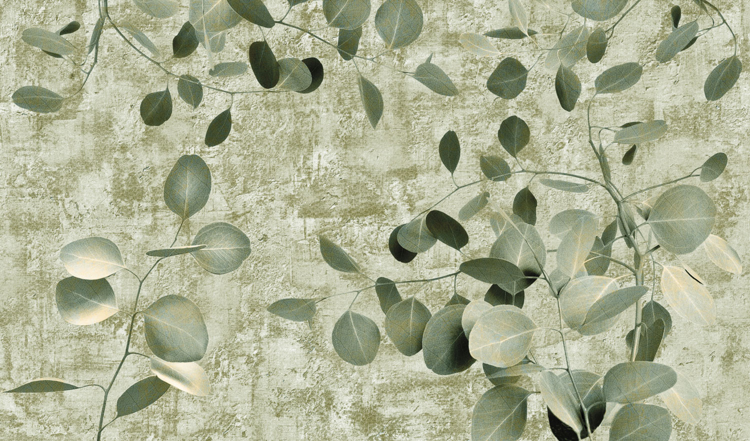 Luxus-Vlies-Fototapete mit geprägter Textiloberfläche, Eukalyptuszweigen und -blättern. Das Innenfoto dient nur zur Veranschaulichung - verschiedene Farben. Abmessungen B. 5,10 m x H. 3 m 5 Teile 1,02 m x 3 m