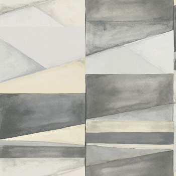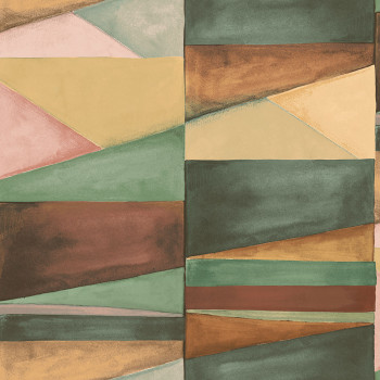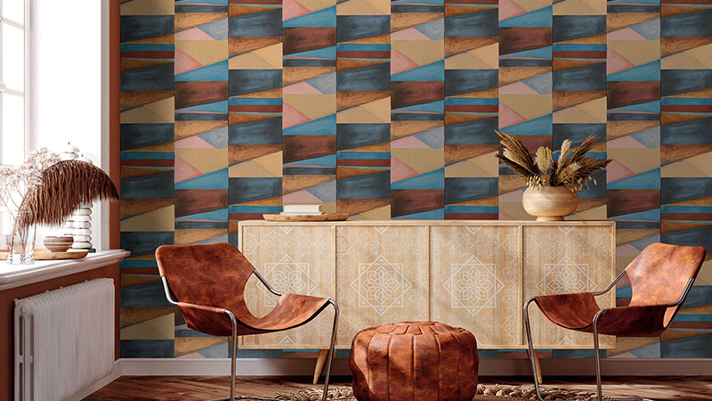 Glatte Vliestapete mit Vinyloberfläche, Farbblöcke in Blau-, Braun- und Hellrosatönen.