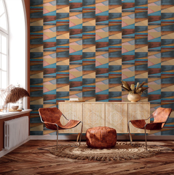 Glatte Vliestapete mit Vinyloberfläche, Farbblöcke in Grün-, Blau- und Hellrosatönen.
