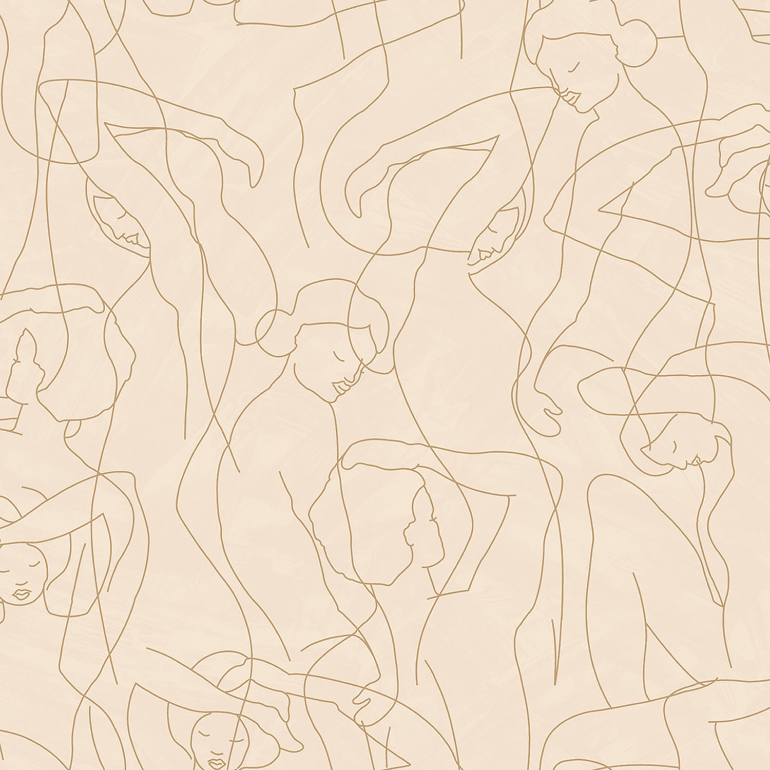 Glatte Vliestapete mit Vinyloberfläche, beige-rosa Hintergrund, braun-goldene Figurenkonturen.