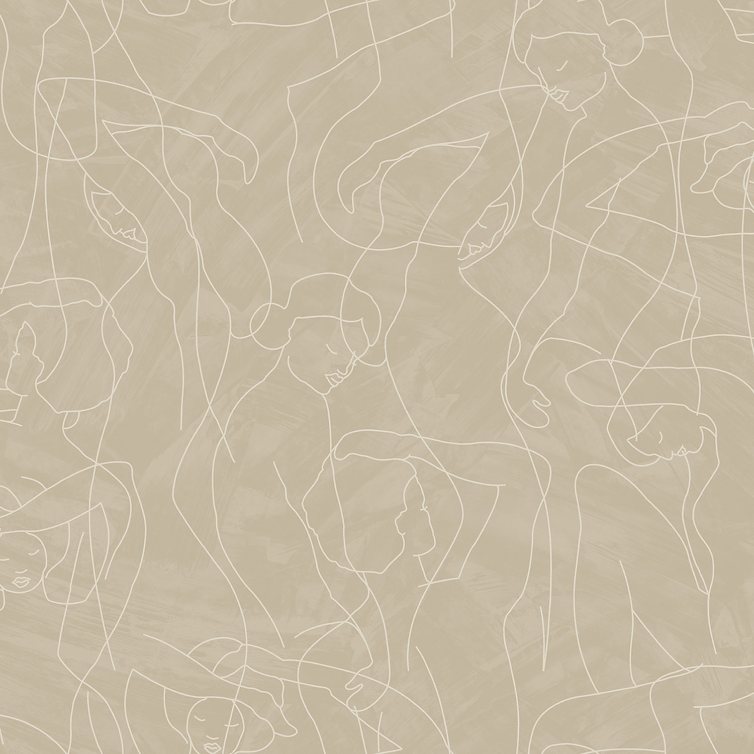Glatte Vliestapete mit Vinyloberfläche, grau-beiger Hintergrund, cremefarbene Figurenkonturen.
