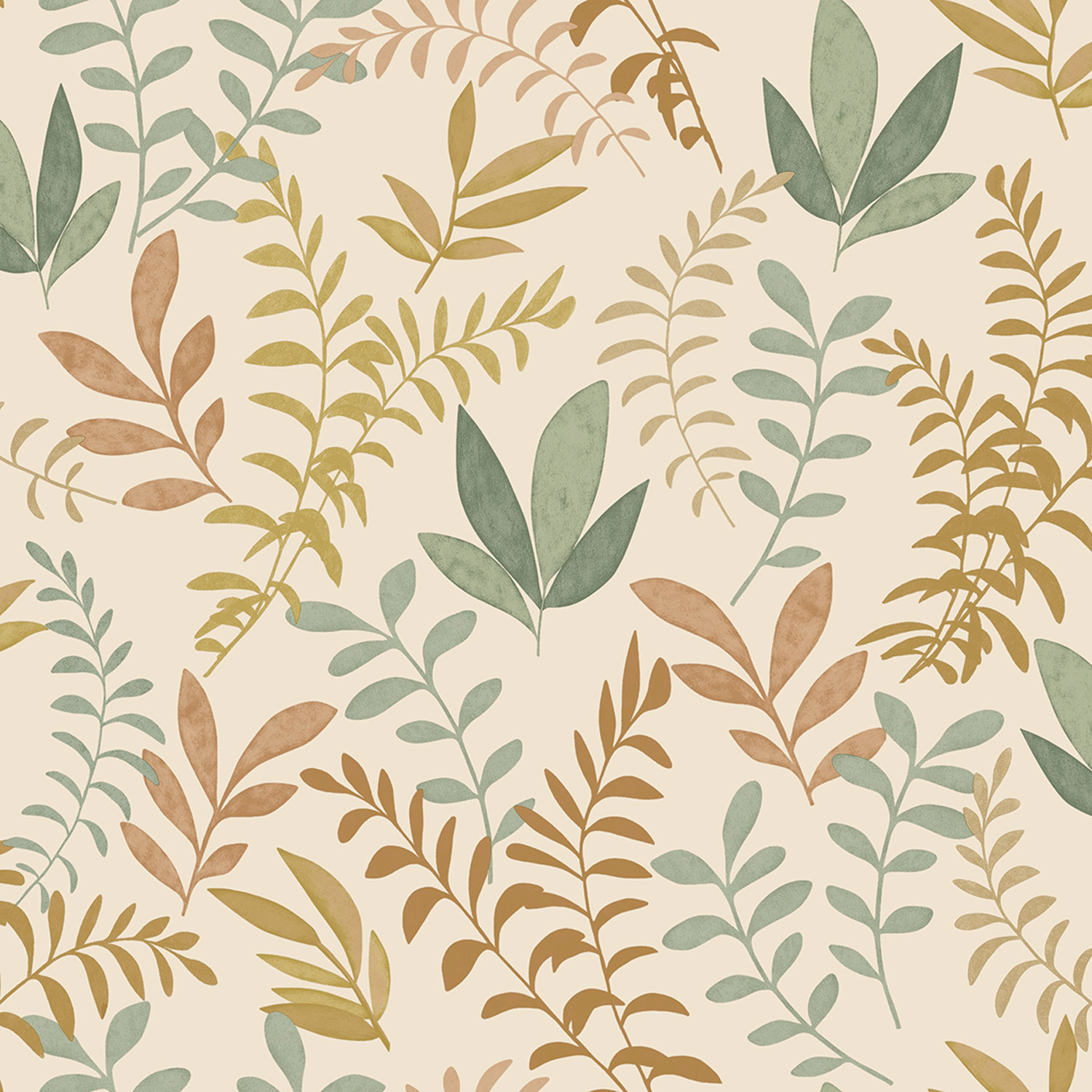 Vliestapete mit Vinyloberfläche, cremefarbenem Hintergrund, Zweigen und Blättern in Grün-, Braun- und Ockertönen.