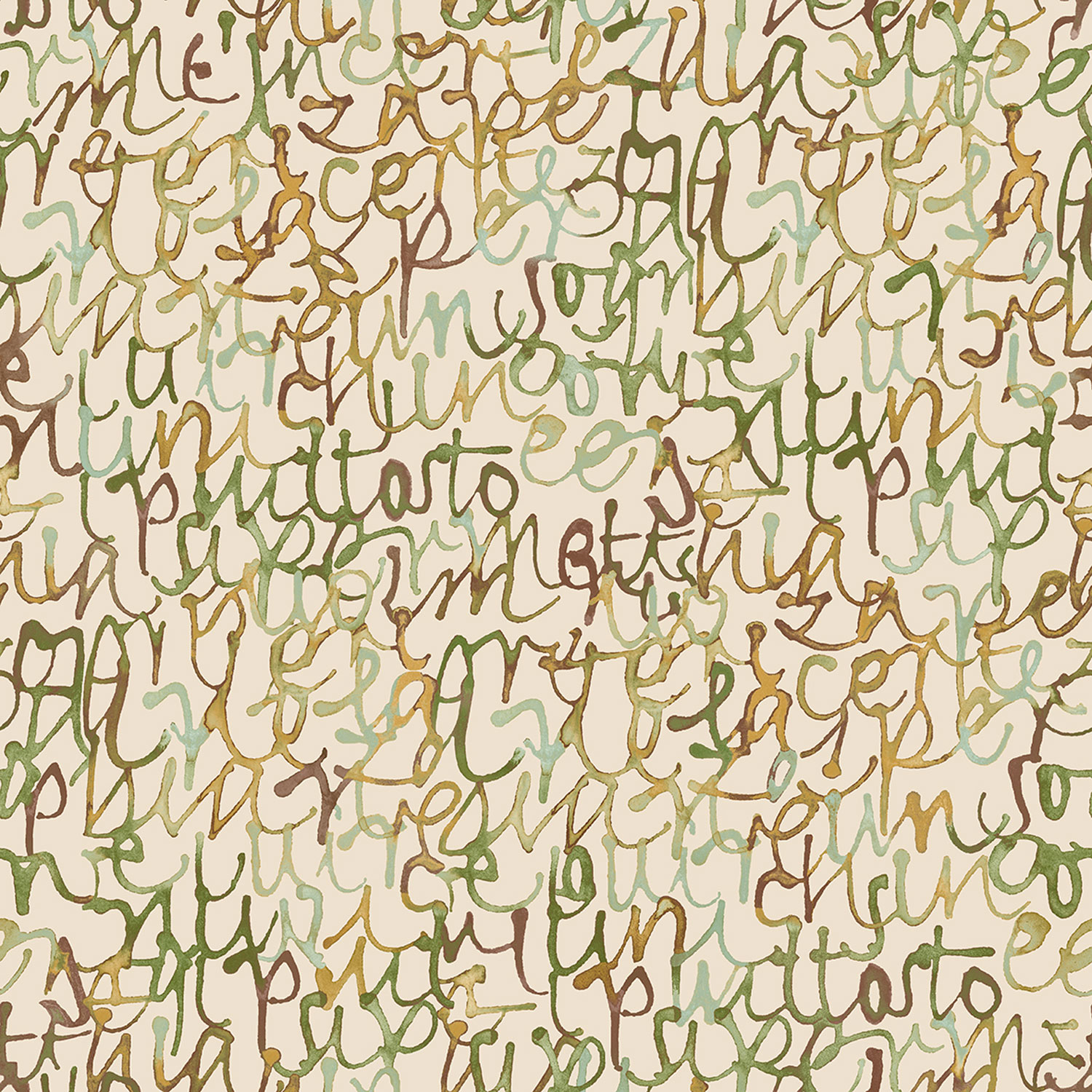 Vliestapete mit Vinyloberfläche, cremefarbener Hintergrund, abstrakter Pinselschriftzug in Grün- und Ockertönen.