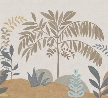 Vliestapete mit Vinyloberfläche, Landschaftsmotiv in Grau-, Braun- und Ockertönen.