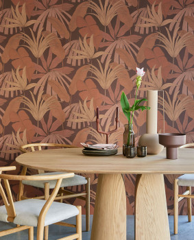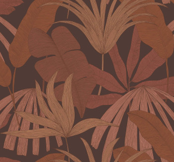Glatte bordeauxrote Vliestapete, tropische Palmenblätter in Terrakotta- und Brauntönen.