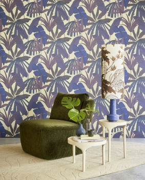 Glatte beige Vliestapete, tropische Palmenblätter in Blau- und Lilatönen.