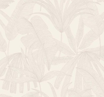 Glatte, matte, cremefarbene Vliestapete, tropische Palmenblätter in glänzenden Perlmutttönen. Das Innenfoto dient nur zur Veranschaulichung - verschiedene Farben.