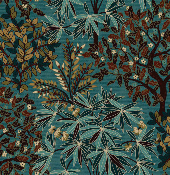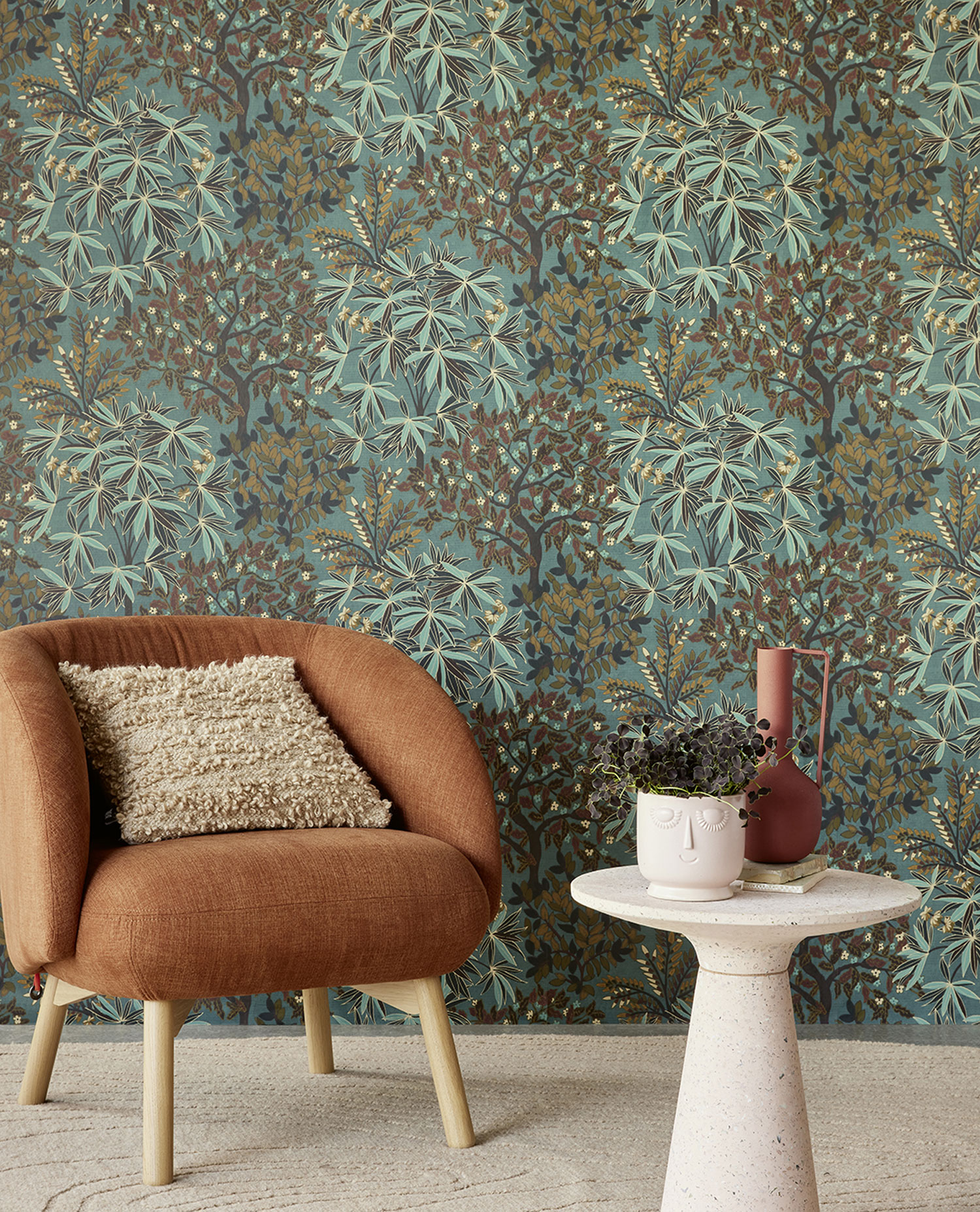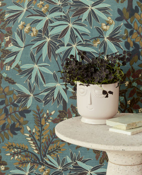 Grün-blaue, fein strukturierte Vliestapete, Zweige und Blätter in Grün-, Blau-, Ocker- und Brauntönen.