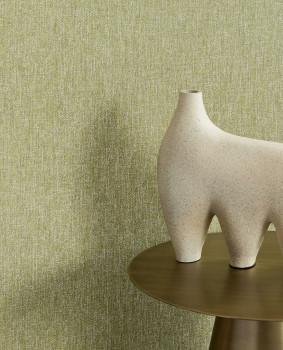 Grüne, fein strukturierte Vliestapete, das Muster erinnert an die Stoffstruktur.