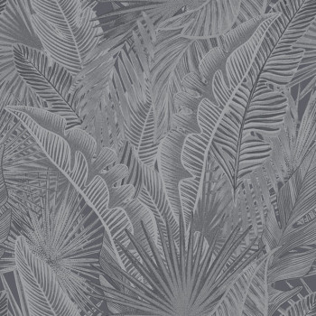 Vliestapete mit Vinyloberfläche, Stoffstruktur, tropischen Blattmotiven in Grau- und Schwarztönen.