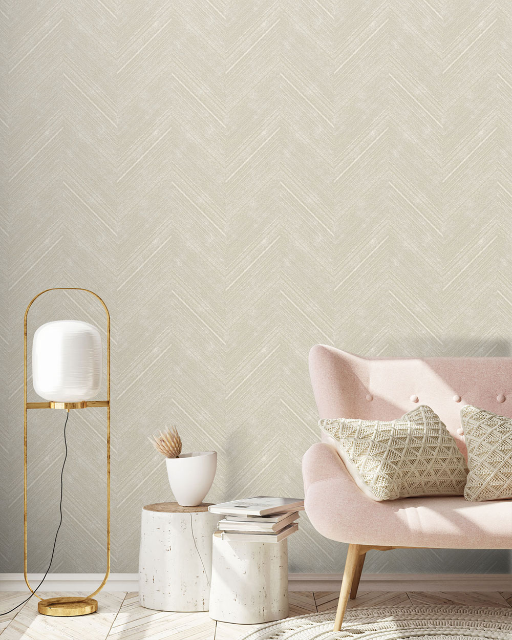 Vliestapete mit Vinyloberfläche, Stoffstruktur, Zickzack-Muster, Beige-, Grau- und Cremetönen.