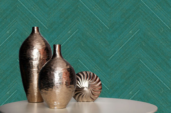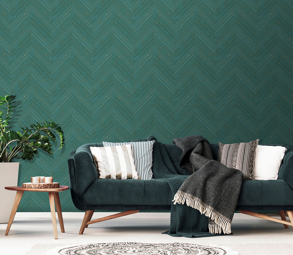 Vliestapete mit Vinyloberfläche, Stoffstruktur, Zickzack-Muster, Grüntöne.