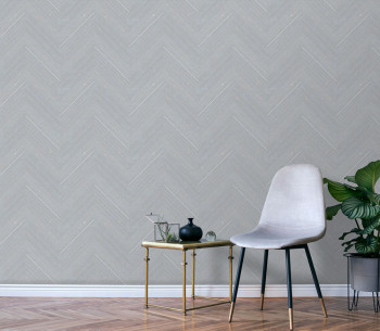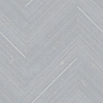 Vliestapete mit Vinyloberfläche, Stoffstruktur, Zickzack-Muster, Blau- und Grautönen.