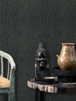 Halbglänzende Vliestapete mit Vinyloberfläche, Imitation von Schlangenhaut in blaugrauen Farbtönen, halbglänzendes Goldmetall.