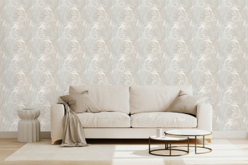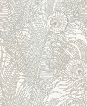 Vliestapete mit Vinyloberfläche, Pfauenfedermotive in Creme-, Hellblau- und Grautönen.