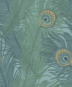 Vliestapete mit Vinyloberfläche, Pfauenfedermotive in Grün-, Türkis- und Metallic-Goldtönen.